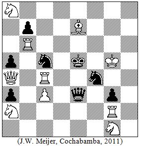 "De Blokkade" door Hans Meijer Bolivia is met een oppervlakte van ruim een miljoen vierkante kilometer (duizend bij duizend kilometer) nummer 27 van de wereld. Nederland staat met veertigduizend vierkante kilometer (tweehonderd bij tweehonderd kilometer) op de 134ste plaats. Als we Bolivia op het schaakbord afbeelden, zoals ik hieronder gedaan heb, dan bedekt Nederland slechts twee en een half vakje. Qua oppervlakte stelt ons land dus niet zo heel veel voor. Hoewel? Nog niet zo lang geleden was het elk jaar afwachten of het eerste van Promotie niet toevallig in dezelfde poule als Sas van Gent, Terneuzen of Middelburg terechtgekomen was. Ik herinner me dat toen Promotie in 2006 Oegstgeest'80 verpletterend versloeg en als gevolg daarvan Middelburg degradeerde een van onze tegenstanders zich troostte met de gedachte dat hij het jaar erop in ieder geval niet naar Middelburg hoefde. Hier in Bolivia ligt dit allemaal wat anders. Wij zijn mensen van de wereld en bereizen alle vierenzestig velden van het schaakbord. Voor negen partijtjes rapidschaak moet je hier al gauw vijf tot zes dagen uittrekken. Dat was ook het geval voor het 'Raices del Chaco' rapidschaaktoernooi dat van vrijdag 16 tot zondag 18 september in Yacuiba verspeeld werd. Op woensdag 14 september arriveerde mijn reisgenoot Carlos Saavedra uit La Paz (Da4) in Cochabamba (Ke5). De volgende morgen wilden we de bus naar Santa Cruz (Kg5) nemen voor een rit die zo'n acht uur in beslag zou nemen. Een volgende bus zou ons daarna door de nacht van Santa Cruz naar Yacuiba (Pg1) brengen waar we zo'n tien uur later in de vroege morgen zouden arriveren. Ruim op tijd voor het rapidschaaktoernooi dat op vrijdagmiddag om drie uur begon. In Bolivia doe je er echter verstandig aan voordat je op reis gaat de actuele geopolitieke situatie te peilen, zie de diagramstelling. De interpretatie van deze stelling is als volgt. De witte pion en de zwarte pionnen stellen wegblokkades voor. De witte torens zijn politie eenheden. De zwarte pion op a5 staat voor de 'de duizend kruispunten blokkades' in La Paz (Da4) en de zwarte pion op a3 voor de blokkade van de weg van La Paz naar Oruro bij Senkata, een stadswijk van El Alto (Pa2). De duizend blokkades in La Paz werden na een dag opgeheven en die bij Senkata verdween na onderhandelingen. Het zwarte paard op c5 representeert de duizend mannen, vrouwen en kinderen van de TIPNIS mars. Zij zijn van Trinidad (Le7) te voet onderweg naar La Paz (Da4) om daar aandacht te vragen voor hun protest tegen de geplande aanleg van een weg door het nationale park Isiboro S?cure (isiborosecure.com). Bij Yucumo (c3) geeft de witte pion de wegblokkade weer van een groep kolonisten, lees medestanders van de regering, die de TIPNIS protestmars de weg naar La Paz versperren. Een grote politie eenheid (Tc4) is door de regering vlakbij Yucumo neergezet om een confrontatie van deze twee groepen te voorkomen. Een andere interpretatie is dat deze politie eenheid feitelijk de doorgang van de TIPNIS mars blokkeert. De zwarte pion op b7 stelt de blokkade bij El Naranjal van de weg van Cobija (Pa8) naar La Paz (Da4) voor. Deze blokkade was een steunblokkade voor de TIPNIS mars die razendsnel door een politie eenheid (Tb6) ge?limineerd werd. Carlos Saavedra en ik waren uiteraard met name ge?nteresseerd in hetgeen ons bij Camiri (g3) te wachten stond. De blokkade van de weg van Santa Cruz (Kg5) naar Yacuiba (Pg1), een andere steun blokkade voor de TIPNIS mars, was aangekondigd maar zonder dat er een specifieke datum aan gekoppeld was. Navraag bij de busterminal in Cochabamba leerde ons dat men hiervan op de hoogte was maar verder tastte men in het duister. Wij besloten onze reis naar Yacuiba af te blazen. Het vooruitzicht om uren, zo niet dagen, in een bus voor een wegblokkade stil te staan, trok ons bepaald niet. De blokkade van de weg van Santa Cruz naar Yacuiba liet echter tot maandag op zich wachten. Opmerkelijk was dat ook deze blokkades, bij Urundait? en Aguayrenda, door politie eenheden (Tg2) vrijwel onmiddellijk in opdracht van de regering ontmanteld werden. Carlos Saavedra en ik hadden dus rustig naar Yacuiba af kunnen reizen. Nu wij niet meededen werd het 'Raices del Chaco' rapidschaaktoernooi gewonnen door IGM Oswaldo Zambrana (ELO 2495) uit Sucre (De3) met 8.5 uit 9. FM Jos? Daniel Gemy (2262), FM Eduardo Peralta (2228) uit Paraguay en FM Mario Iver Lopez (2236), met 7 uit 9, en FM Carmelo Guti?rrez (2278) uit Peru en Ariel Mart?nez (2229), met 6.5 uit 9, volgden. In de prijzenpot zaten B$ 19.000 waarvan er B$ 5000, zo'n vijfhonderd euro, bestemd waren voor de winnaar. Tot slot enkele schaaktechnische kanttekeningen. De mooiste blokkade partij ooit speelde Aaron Nimzowitsch tegen Paul Johner, uit 'Mein System' (1925). Nimzowitsch schatte deze partij zelfs hoger in dan zijn 'onsterfelijke Zugzwang' partij. 'Zuerst hemmen, dann blockieren und schliesslich vernichten!' (Eerst tegenhouden, dan blokkeren en ten slotte vernietigen!) was bij blokkade partijen Nimzowitsch's leidmotief. Paul Johner - Aaron Nimzowitsch (Dresden, 1926) 1.d4 Pf6 2.c4 e6 3.Pc3! Lb4 4.e3 0-0 5.Ld3 c5 6.Pf3 Pc6 7.0-0 Lxc3 8.bxc3 d6 9.Pd2! b6 10.Pb3? e5 11.f4 e4 12.Le2 Dd7! 13.h3 Pe7 14.De1 h5! 15.Ld2 Df5! 16.Kh2 Dh7! 17.a4 Pf5 18.g3 a5! 19.Tg1 Ph6 20.Lf1 Ld7 21.Lc1 Tac8 22.d5 Kh8 23.Pd2 Tg8 24.Lg2 g5 25.Pf1 Tg7 26.Ta2 Pf5 27.Lh1 Tcg8 28.Dd1 gxf4 29.exf4 Lc8 30.Db3 La6 31.Te2 Ph4 32.Te3 Lc8 33.Dc2 Lxh3! 34.Lxe4 Lf5 35.Lxf5 Pxf5 36.Te2 h4 37.Tgg2 hxg3+ 38.Kg1 Dh3 39.Pe3 Ph4 40.Kf1 Te8! 0-1 Aan het Boliviaanse blokkade probleem heb ik Samaipata (Pf4), dit vanwege zijn fameuze 'Palacio de Ajedrez' (elpalaciodelajedrez.wordpress.com), toegevoegd. Opgave: Mat in twee zetten. |