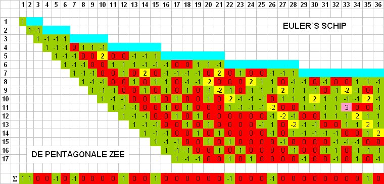 "Een bijzonder toernooi" door Hans Meijer Tot mijn verrassing kreeg ik een e-mail van de directeur van het Corus schaaktoernooi. Hij had op de Promotie website mijn column over de 'Twee jarige schakers' gelezen en vroeg mij of ik de opstelling voor de hoofdgroep van Corus 2009 wilde maken. Het moest het 7D of '1 keer in de 70.000 jaar' toernooi worden liet hij mij weten. Deze extreem kleine kans moest samen met de speciaal ontworpen '7-dimensionale' affiches extra publiciteit voor Corus 2009 gaan genereren. Ik dacht na over de te volgen strategie voor mijn uitnodigingsbeleid. Zoveel mogelijk van de 14 deelnemers moesten tot de wereldtop behoren en zo niet dan moesten ze voor een breed publiek interessant zijn. De 7 paren vereiste de juiste combinatie van de geboortejaren. Voor de kans van 1 op 70.000 was verder een tijdspanne van 23 jaar tussen de jongste en oudste schakers een extra vereiste. Hoe zat het precies met de kansen van de verschillende combinaties van geboortejaren? Hoeveel van die combinaties zijn er eigenlijk mogelijk bij 14 schakers? Bij vier deelnemers zijn het er vijf: 4V, 1D + 2V, 1T + 1V, 2D, 4-T, met V voor verschillende geboortejaren, D voor duo, T voor triple en 4-T voor 4-tuple. Deze vraag bleek regelrecht naar de partitiefunctie p(n) te leiden. Andr? Weil schreef in zijn boek 'Number theory' (2001) dat Leonhard Euler, een van de grootste wiskundigen aller tijden, in 1740 de partitiefunctie als eerste diepgaand bestudeerde. Zonder hiervan op de hoogte te zijn vond ik dat p(14) = 135 en ontdekte op basis van de formules voor p(n,k), die het aantal partities met als kleinste getal k representeren, Euler?s schip en de Pentagonale Zee. De schitterende dekken van dit fantastische schip blijken totaal onverwacht naar zijn beroemde pentagonale getallen theorema te leiden. Een wonderbaarlijk geheel 1).  Figuur 1. Euler's schip op de Pentagonale Zee. Een ander punt van aandacht was mijn veronderstelling bij het berekenen van de kansen dat alle geboortejaren van de absolute top even waarschijnlijk zijn. Ik bestuurde de FIDE top 101 lijst van april 2008 met de geboortejaren. Vooraf had ik er 101 flessen wijn op willen zetten dat de geboortejaren uniform verdeeld zijn maar na het bekijken van de FIDE lijst was ik niet zo zeker van mijn zaak. Het werd me al snel duidelijk dat om tot de top 101 te behoren je tussen 1965 en 1990 geboren moet zijn. Slechts vijf schakers, waaronder Karpov uit 1951, Beliavsky uit 1953 en onze medelander Nikolic uit 1960, zijn ouder en laat ik hier verder buiten beschouwing. Op wereldniveau gaat een schaker dus, op een enkele uitzondering na, maar 26 jaar mee. Dat is niet lang. Als we 96 delen door 26 dan geeft dat 3.7 topschakers gemiddeld per jaar. Ik telde in de gauwigheid 10 schakers in 1983, 0 in 1984 en 8 in 1985. Was de top 96 wel uniform verdeeld? Gelukkig is er de Chi-kwadraat test om dit te toetsen. Deze vertelde me dat alles in orde was. Voor alle zekerheid raadpleegde ik Manuel Nepveu. De kritiek op de Chi-kwadraat toets van onze Bayesiaan was niet van de lucht. Hij raadde mij de maximum entropie methode aan. In het boek 'Probability Theory: The logic of science' (2003) van Edwin T. Jaynes kon ik er alles over lezen. Ook was een andere hypothese als alternatief voor de uniforme verdeling absoluut noodzakelijk. Al mijn tegenargumenten, zoals 'Maar Manuel, volgens het boek van Jaynes geldt dat bij netjes toetsen Psi = 2.17ChiK, dus waar hebben we het eigenlijk over?', mochten niet baten. Ik had al gelezen dat Bayes aanhangers overtuigd zijn van hun eigen gelijk en nu maakte ik het van nabij mee. Ik ging door de knie?n en verzon als alternatief de hypothese dat jeugdigen en ouderen ieder 10 procent van de populatie uitmaken en de middengroep de resterende 80 procent. Mijn conclusie was dat beide verdelingen acceptabel zijn maar dat de 10/80/10 verdeling verreweg het beste voldoet. Voor mijn berekening van de kansen had ik echter al de simpele uniforme verdeling gebruikt. Ik besloot gewoon verder te gaan op de ingeslagen weg. Dat was wel zo gemakkelijk 2). Terug naar mijn vraag over de kansen van optreden van de verschillende combinaties. De top 15 combinaties voor n =14 en D =23 jaar zijn, in volgorde van afnemende grootte van de kans van optreden: 3D, 2D, 2D+1T, 4D, 1D+1T, 3D+1T, 1D, 5D, 1D+2T, 1T, 1D+1 4-T, 2T, 4D+1T, 2D+2T, V; daar waar nodig aangevuld met V?tjes voor de rest van de schakers. Opmerkelijk is dat de kans op de 3D combinatie het grootst is en dat de kans dat alle 14 schakers in een ander jaar geboren zijn pas op de vijftiende plaats staat. De gezamenlijke kans van de top 15 is p = 0.95. Voor de resterende 120 combinaties is dan nog p = 0.05 over. Dat is niet bijster veel 3). Na enig puzzelen had ik mijn lijst met deelnemers klaar: Sokolov (29) en Gelfand (16) uit 1968; Anand (1) en Ivanchuk (11) uit 1969; Shirov (12) en van Wely (45) uit 1972; Kramnik (2) en Topalov (4) uit 1975; Sutovsky (93) en Morozovich (3) uit 1977; Radjabov (8) en Nakamura (34) uit 1987; Carlsen (5) en Karjakin (13) uit 1990. Als reserve paren noteerde ik: Aronian (6) en Vallejo Pons (38) uit 1982 plus Mamedyarov (7) en Navara (50) uit 1985. Tussen haakjes staat een ieders plaats op de FIDE ratinglijst van april 2008 genoteerd. Ik had mijn opdracht al afgerond toen ik de column 'Kampioen van Europa' van Ruurd Kunnen van 3 mei onder ogen kreeg. Tiviakov was in Plovdiv Europees kampioen geworden door in de laatste ronde Sutovsky te verslaan. Volgens Ruurd moest de Nederlandse schaakwereld dit succes op passende wijze waarderen. Een uitnodiging voor de hoofdgroep van het volgende Corus toernooi was wel het minste. Tkachiev (64) en Tiviakov (85) leek me het interessantste 1973 duo. Mijn lijstje met zeven paren plus drie reserve paren voor het Corus 7D 2009 toernooi kon op de post. 1) Het vijfde dek van Euler?s schip kan als volgt ge?nterpreteerd worden: p(n,5) = p(n-5) - p(n-6) - p(n-7) + 2p(n-10) - p(n-13) - p(n-14) + p(n-15) met p(0) = 1 en voor n = -1,-
