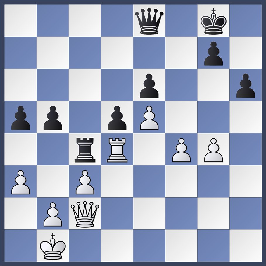 Zwart probeerde toch iets te forceren, en speelde 31. … Da5, met de matdreiging De1#. Ik maakte een luchtgaatje met 32. g3, en zag toen dat dit misschien niet de handigste oplossing was. Als zwart toch 32. … De1+ zou spelen, dan kon hij na 33. Kg2 de dame naar c1 spelen, met de dreiging Db2. Omdat de witte dame dan staat aangevallen en nergens heen kan moet wit de zwarte dame dan wel slaan, waarna de pion terugslaat en vervolgens promoveert. Zwart speelde echter niet 32. … De1+, maar deed 32. ... Kf7, zodat ik alsnog 33. Kf1 kon doen om de zwarte dame van e1 af te houden. Het eindigde vervolgens inderdaad in remise. ’s Avonds in bed spookte dit alles door mijn hoofd, en bedacht ik dat 32. … De1+, 33. Kg2 Dc1 misschien toch geen probleem was, omdat wit dan waarschijnlijk 34. De2 kan spelen, op weg naar een eeuwigschaak-situatie. ’s Morgens nog eens verder bekeken, en dat bleek te kloppen: 34. … Db2,35. Dg4 a2, 36. De6+ en eeuwig schaak! | | | Rating | | | Rating | |