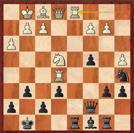 Na de bekende rustige opbouw van een stevige stelling gericht op e5 is het (inderdaad) wachten op een fout van de tegenstander en die deed hij op de 21ste zet. De foute zet f7-f6 leidde tot bijgaande stelling en daarna was c3-c4 (c3 stond daar niet voor niks) de zet om te oogsten. En na f6-f5 en dxe5 helemaal. Daarna heeft zwart nog 10 zetten tot ca 11 uur gesparteld. Bord 7. Dolf Mijn tegenstander koos met wit voor de Londenopening, waarbij de partij tot zet 25 redelijk gelijk opging, met uitruil van de twee paarden en lopers, doch hij wist daarna de druk op mijn koningsvleugel op te voeren, waarbij hij op zet 28 kwaliteitsvoordeel bereikte met Pe7xTc6, waartegenover mijnerzijds enkel b7xPc6 mogelijk was, hetgeen mijn koningsvleugel ernstig verzwakte, waarna ik op zet 31 opgaf. Bord 8. Rob Ik speelde met wit tegen Danny Lim, die een rating heeft van 1511, maar dat was een jaar geleden nog 1637. Gedurende de eerste 20 zetten vond ik dat ik beter stond, en dat wordt bevestigd door de Lichess-analyse; na zet 7 was de waardering bijvoorbeeld +2,2. Nadat ik echter 22. Ta1-c1 gespeeld (zie diagram) was de waardering omgeslagen naar voordeel voor zwart: -0,8.