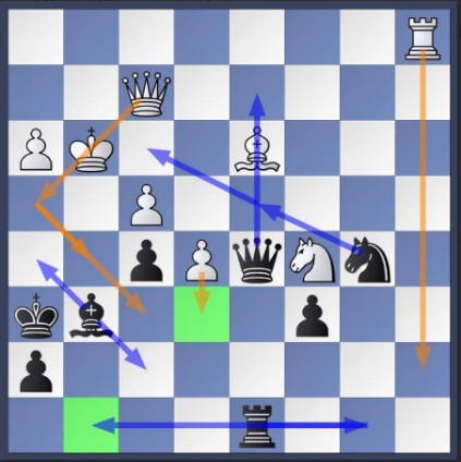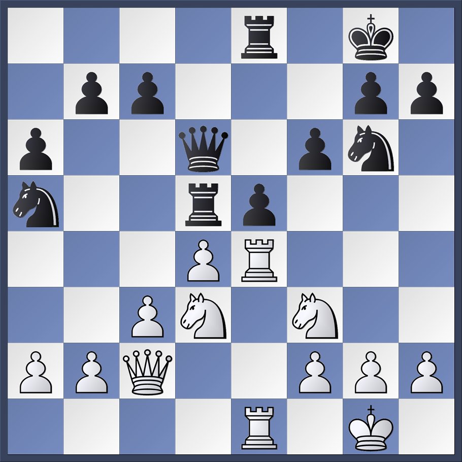 John aan bord 1: Een pion buitgemaakt in het middenspel. De pluspion netjes meegenomen naar het eindspel T+4p vs T+3p. Het is dan wel vervelend dat een goede speler (2195) precies weet hoe hij een toren-eindspel moet behandelen. Op de 50ste zet kwamen wij remise overeen. Fritz vond het al 20 zetten eerder helemaal niks. Jo aan bord 2: Na in de opening onnodig een pion te zijn kwijtgeraakt, speelde mijn tegenstander dit heel beheerst, geen kansen weggevend, uit. Frans aan bord 3: Mijn tegenstander speelde een -voor mij-onbekend systeem tegen de d4 opening, met versneld Ld7. Omdat hij de rokade lang uitstelde had ik in het centrum sneller mijn pionnen kunnen (en moeten) opspelen. Er ontstond na rokade en dameruil een evenwichtige stelling, waarna we tot remise besloten. Rob aan bord 4: Ik speelde met zwart tegen een speler met rating 1701, die tot nu toe in DSC 8 een score van 2 uit 2 had. In de diagramstelling (die volgens Lichess de waardering +3 heeft) had wit 14. f2-f4 gespeeld. Zwart beantwoordde dit met 14. … Peg4, waarop wit de paardvork op e3 verhinderde met 15. Te1. Zwart reageerde hierop met de “rustige” zet 15. Dc7; waardering nog steeds +3. Wit zag het gevaar niet, en speelde 16. h3??, waarmee de waardering omsloeg naar -7,2! Hij had verwacht dat zwart het paard van g4 naar h6 zou spelen, en zat behoorlijk verbijsterd te kijken na 16. … Db6+. Hij kon nu kiezen tussen Kh1 met dameverlies (paardvork) en Kf1 met direct mat. Hij zag de vork, speelde ”dus” 17. Kf1, en was zo mogelijk nog meer verbijsterd na 17. … Df2#. Wel prettig trouwens dat de drie stukken die het schaak van Db6 door tussenplaatsing zouden kunnen opheffen alle drie ongedekt zouden staan en dus met opnieuw schaak zouden worden geslagen.