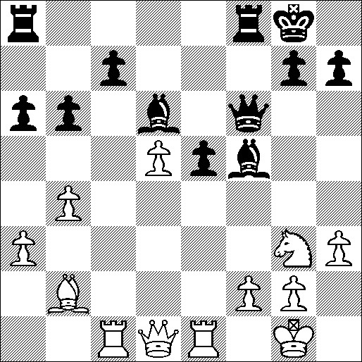 Zwart ging hier verder met 22. … Lxh3! Als ik die loper zou slaan met 23. gxh3 dan zou volgen 23. Dxf2+… (nog een pion), waarna zwart kon kiezen uit de loper op b2 en het paard op g3. Ik speelde “dus” 23. Pe4 (dekt f2); hierna kwam 23. … Dg6, 24. Pg3 (weer terug). Helaas, nu was de waardering -5,8 (bleek later). Ik dacht echter nu materiaal terug te winnen: de loper op h3 of de pion op e5, maar had hierbij 24. … Lg4 over het hoofd gezien (veel sterker was overigens 24. … Txf2). Ik spartelde nog wat tegen met 25. Dd2 Tae8, 26. Tc4 h5, 27. Tce4 h4, 28. Ph1, maar toem kwam 28. … Lf3! en was het snel uit. Deze speler leek toch sterker dan zijn rating aangaf… | | | Rating | | | Rating | |